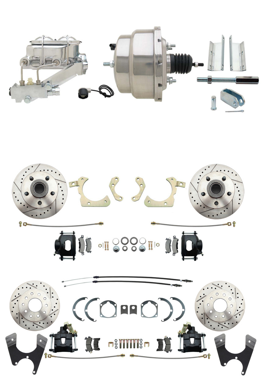 DBK55581012FSLXB-GMFS1-331 - 1955-1958 GM Full Size Front & Rear Power Disc Brake Kit Black Powder Coated Calipers Drilled/Slotted Rotors (Impala, Bel Air, Biscayne) & 8" Dual Chrome Booster Conversion Kit w/ Chrome Master Cylinder Left Mount Disc/