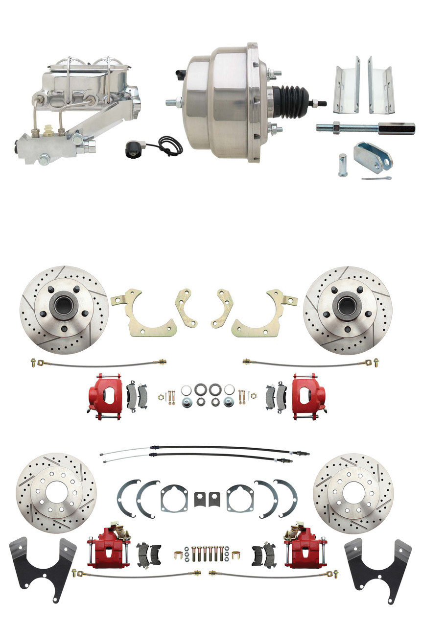 DBK55581012FSLXR-GMFS1-331 - 1955-1958 GM Full Size Front & Rear Power Disc Brake Kit Red Powder Coated Calipers Drilled/Slotted Rotors (Impala, Bel Air, Biscayne) & 8" Dual Chrome Booster Conversion Kit w/ Chrome Master Cylinder Left Mount Disc/ Di