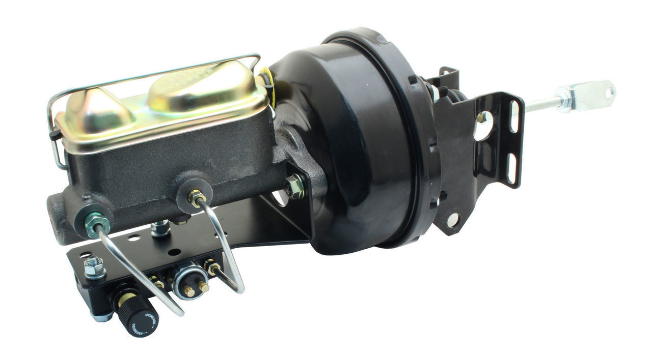 This features an 7" Single Black Powder Coated Power Brake Booster Conversion Kit designed for 1957-77 Ford F-100 Trucks. Combined with a 1" bore master cylinder and bottom mount adjustable proportioning valve/ distribution block, all in one! This kit designed to work for either disc drum or disc disc brakes.