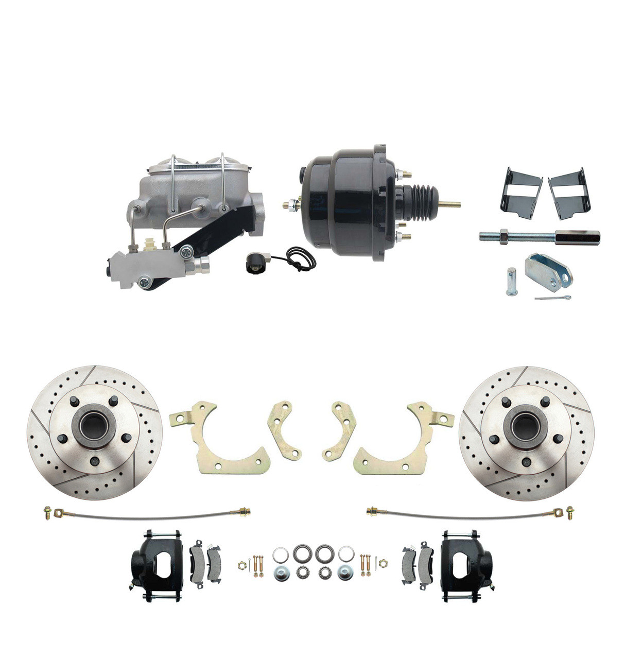 DBK5964LXB-GMFS2-709 - 1959-1964 GM Full Size Front Disc Brake Kit Black Powder Coated Calipers Drilled/Slotted Rotors (Impala, Bel Air, Biscayne) & 8" Dual Powder Coated Black Booster Conversion Kit w/ Aluminum Master Cylinder Left Mount Disc/ Drum