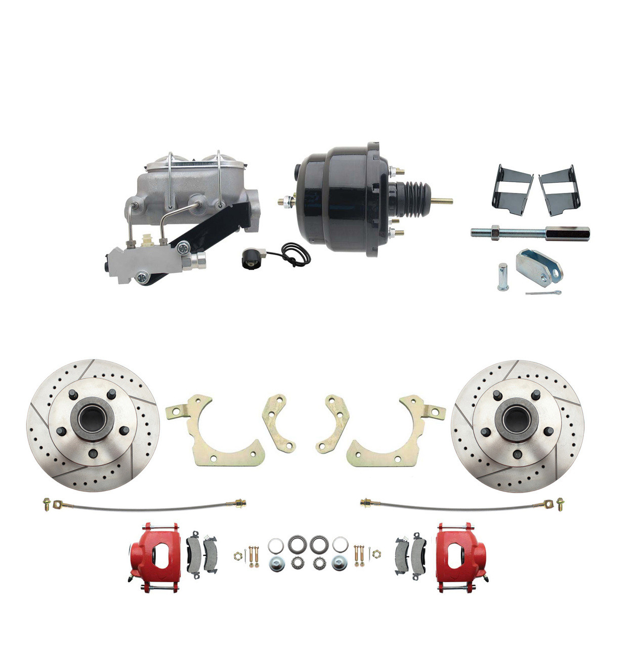 DBK5964LXR-GMFS2-709 - 1959-1964 GM Full Size Front Disc Brake Kit Red Powder Coated Calipers Drilled/Slotted Rotors (Impala, Bel Air, Biscayne) & 8" Dual Powder Coated Black Booster Conversion Kit w/ Aluminum Master Cylinder Left Mount Disc/ Drum P