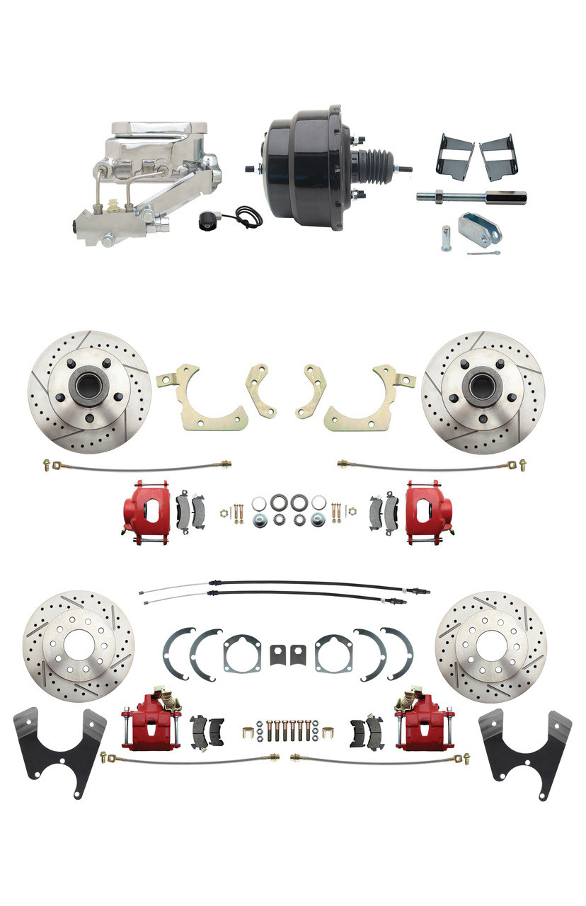 - DBK59641012FSLXR-GMFS2-328 - 1959-1964 GM Full Size Front & Rear Power Disc Brake Kit Red Powder Coated Calipers Drilled/Slotted Rotors (Impala, Bel Air, Biscayne) & 8" Dual Chrome Booster Conversion Kit w/ Flat Top Chrome Master Cylinder Bottom Mou