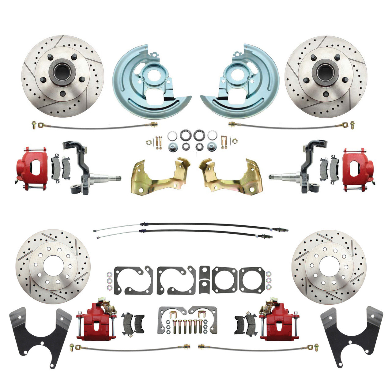 - DBK64721012LX-R - 1964-1972 GM A Body (Chevelle, GTO, Cutlass) Stock Height Front & Rear Disc Brake Kit w/ Drilled & Slotted Rotors Red Calipers