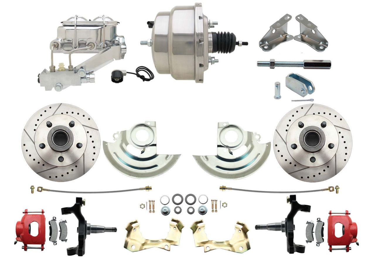 - DBK6472DLXR-GM-311 - 1964-1972 GM A Body Front Power 2" Drop Disc Brake Conversion Kit Drilled & Slotted & Powder Coated Red Calipers Rotors w/ 8" Dual Chrome Booster Kit