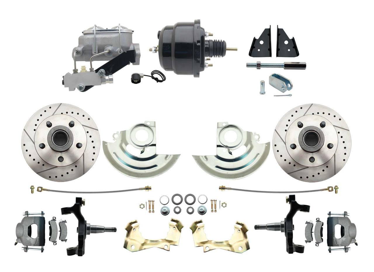 DBK6472DLX-GM-709 - 1964-1972 GM A Body Front Power 2" Drop Disc Brake Conversion Kit Drilled & Slotted Rotors w/ 8" Dual Powder Coated Black Booster Kit