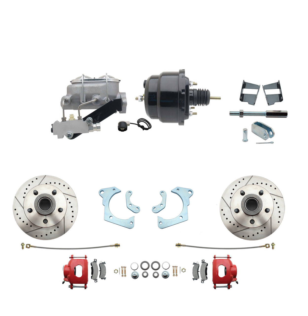 DBK6568LXR-GMFS3-709 - 1965-1968 GM Full Size Front Disc Brake Kit Red Powder Coated Calipers Drilled/Slotted Rotors (Impala, Bel Air, Biscayne) & 8" Dual Powder Coated Black Booster Conversion Kit w/ Aluminum Master Cylinder Left Mount Disc/ Drum P