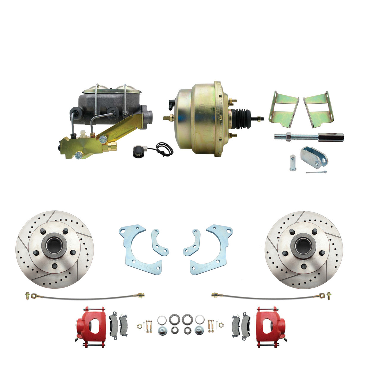 DBK6568LXR-GMFS3-205 - 1965-1968 GM Full Size Front Disc Brake Kit Red Powder Coated Calipers Drilled/Slotted Rotors (Impala, Bel Air, Biscayne) & 8" Dual Zinc Booster Conversion Kit w/ Cast Iron Master Cylinder Left Mount Disc/ Drum Proportioning V