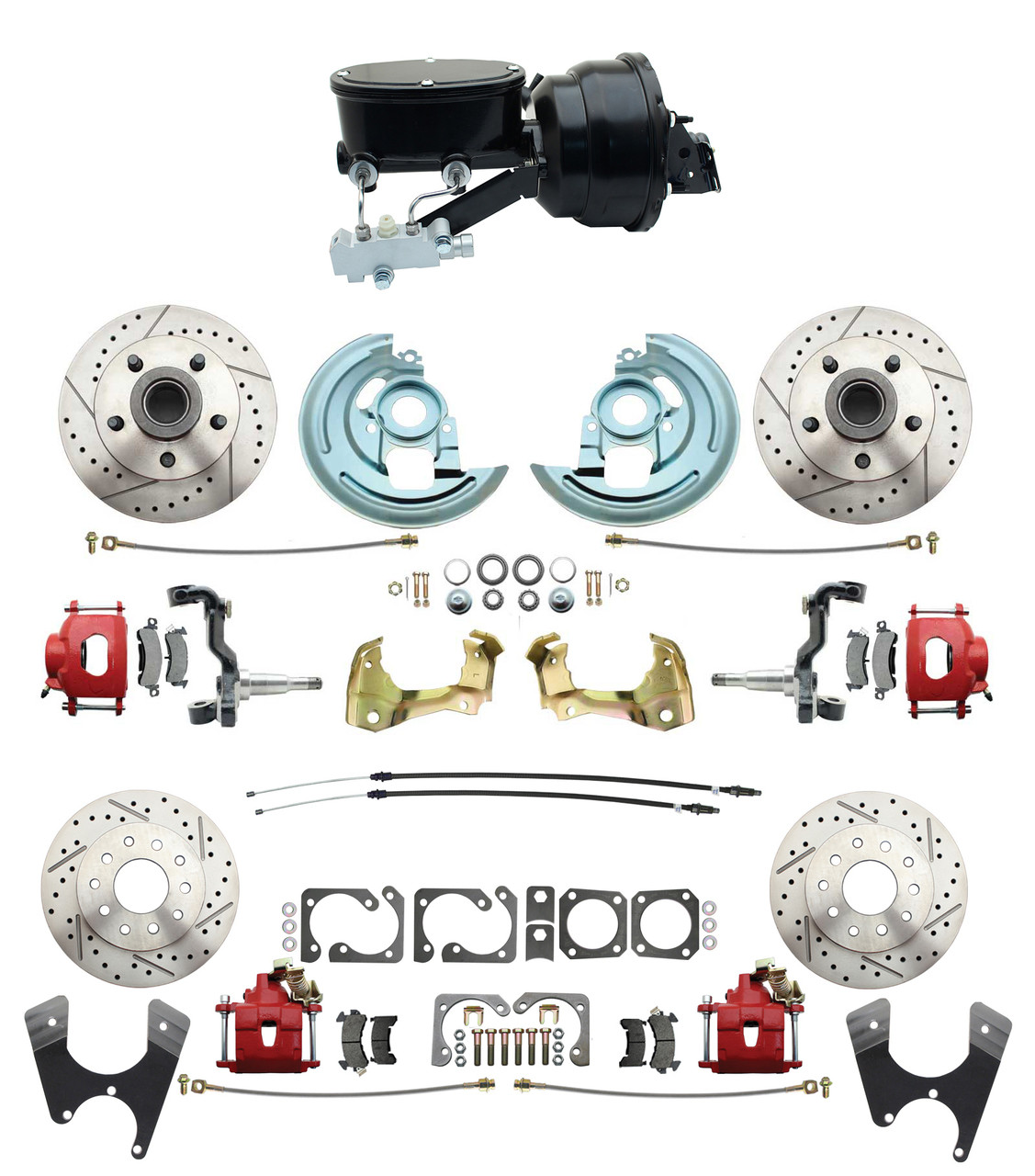 DBK67691012SLXR-GM-415 - 1967-1969 Camaro/ Firebird & 1968-1974 Chevy Nova Front & Rear Power Disc Brake Conversion Kit Drilled & Slotted & Powder Coated Red Calipers Rotors w/ 8" Dual Powder Coated Black Booster Kit