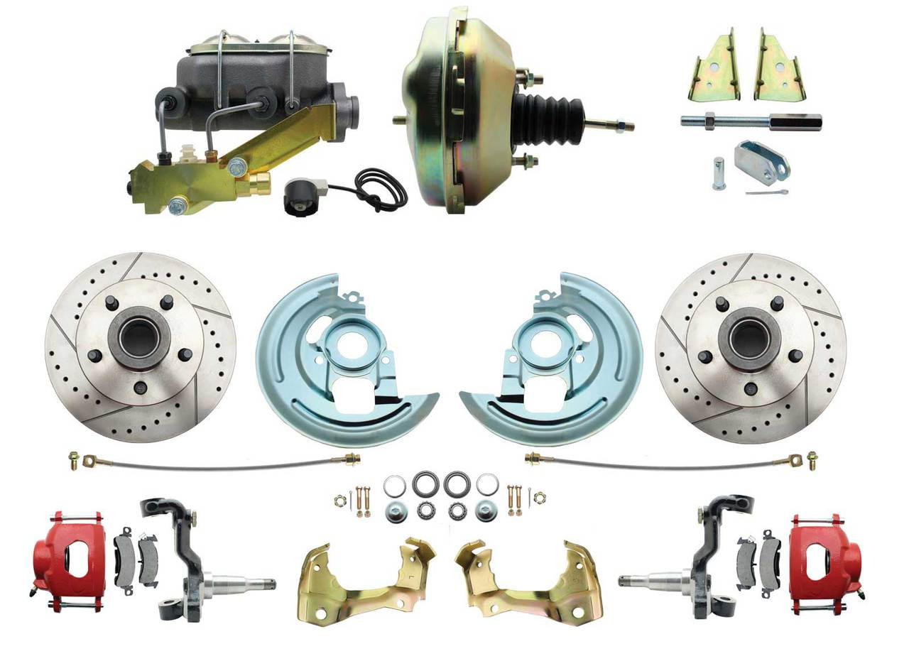 DBK6769LXR-GM-209 - 1967-1969 F Body 1968-1974 X Body Front Power Disc Brake Conversion Kit Drilled & Slotted & Powder Coated Red Calipers Rotors w/9" Dual Zinc Booster Kit