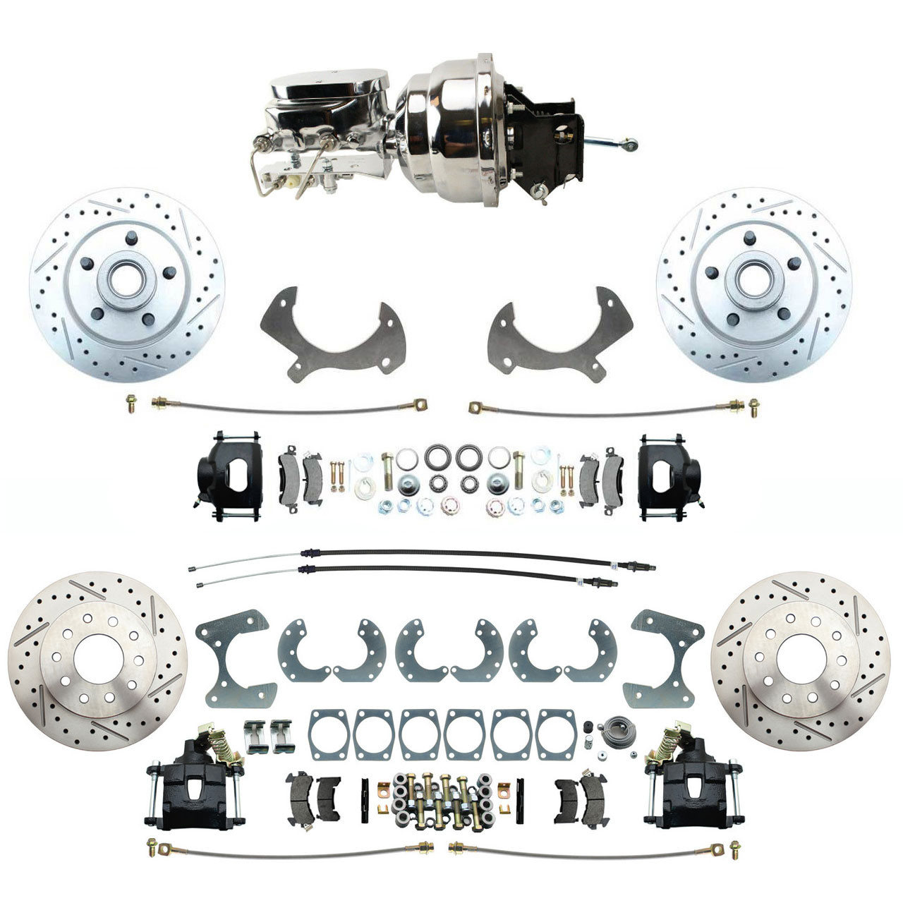 DBK5772-9-LXB-FD-314 1957-1968 Full Size Ford Front & Rear Disc Brake Kit Drilled/ Slotted Rotors & Black Powder Coated Calipers & Chrome Booster Conversion Kit
