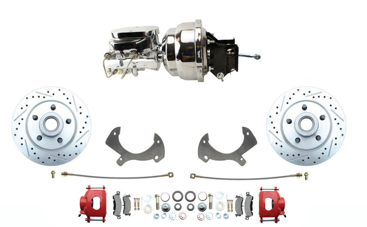 DBK5772LXR-FD-304 1957-1968 Full Size Ford Disc Brake Kit Drilled/ Slotted Rotors & Red Powder Coated Calipers Chrome Booster Conversion Kit