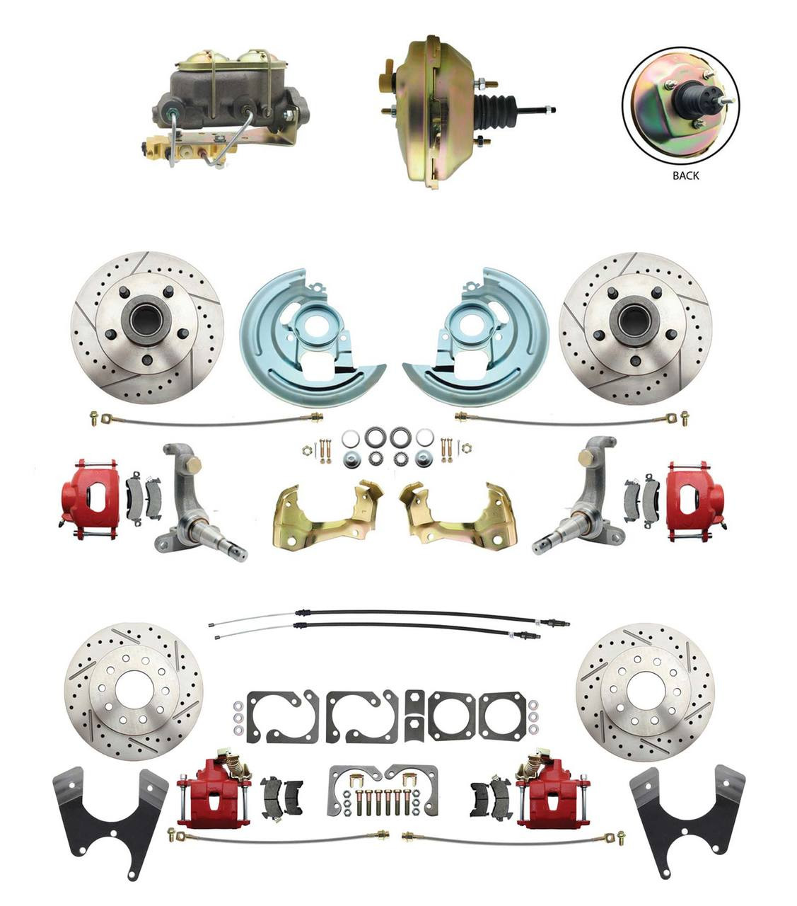 DBK62671012LXB-GM-234 - 1962-1967 Nova Power Front & Rear Disc Brake Conversion Kit Drilled Slotted Rotors Red Calipers w/ 9" 3 Stud Booster