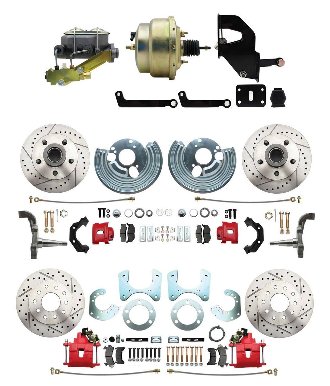 DBK6272834LXR-MP-207 1962-72 Mopar B & E Body Front & Rear Disc Brake Conversion Kit w/ Drilled & Slotted Rotors & Powder Coated Red Calipers ( Charger, Challenger, Coronet) w/ 8" Dual Zinc Booster Conversion Kit w/ Left Mount valve Kit