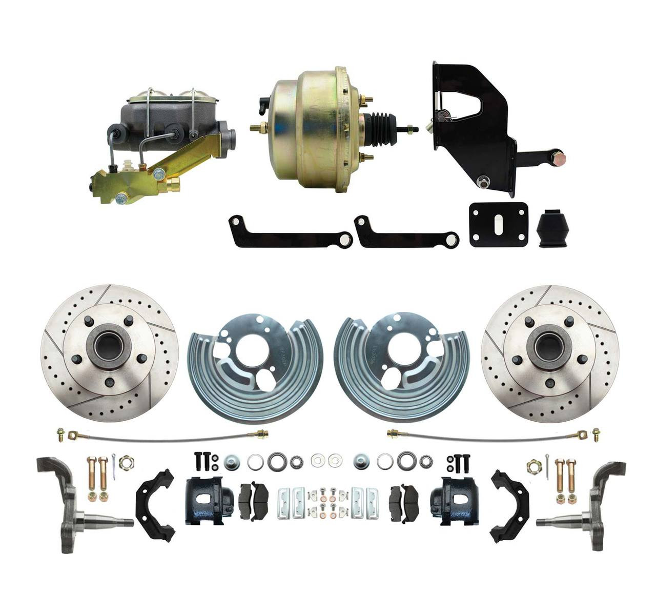 DBK6272LXB-MP-202 1962-1972 Mopar B & E Body Front Disc Brake Conversion Kit w/ Drilled & Slotted Rotors & Powder Coated Black Calipers ( Charger, Challenger, Coronet) w/ 8" Dual Zinc Booster Conversion Kit w/ Left Mount proportioning valve Kit