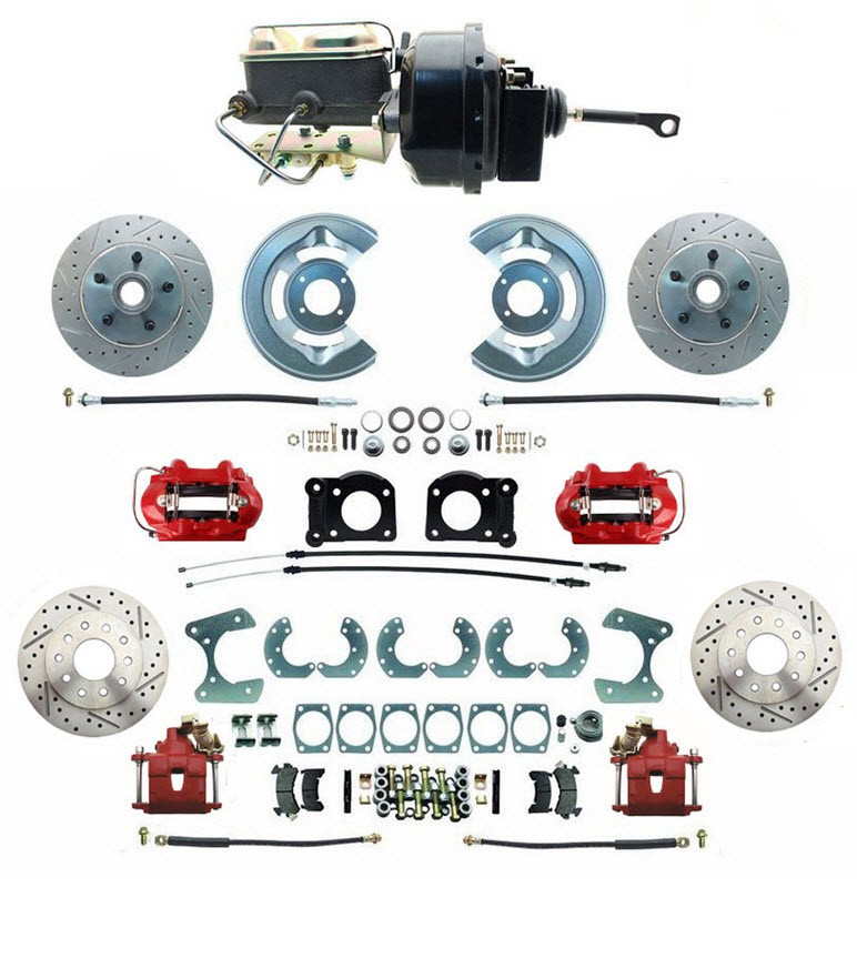 DBK6473-9LXR-FD-250-D - 1964.5-1966 Ford Mustang Front & Rear Power Disc Brake Conversion Red Calipers