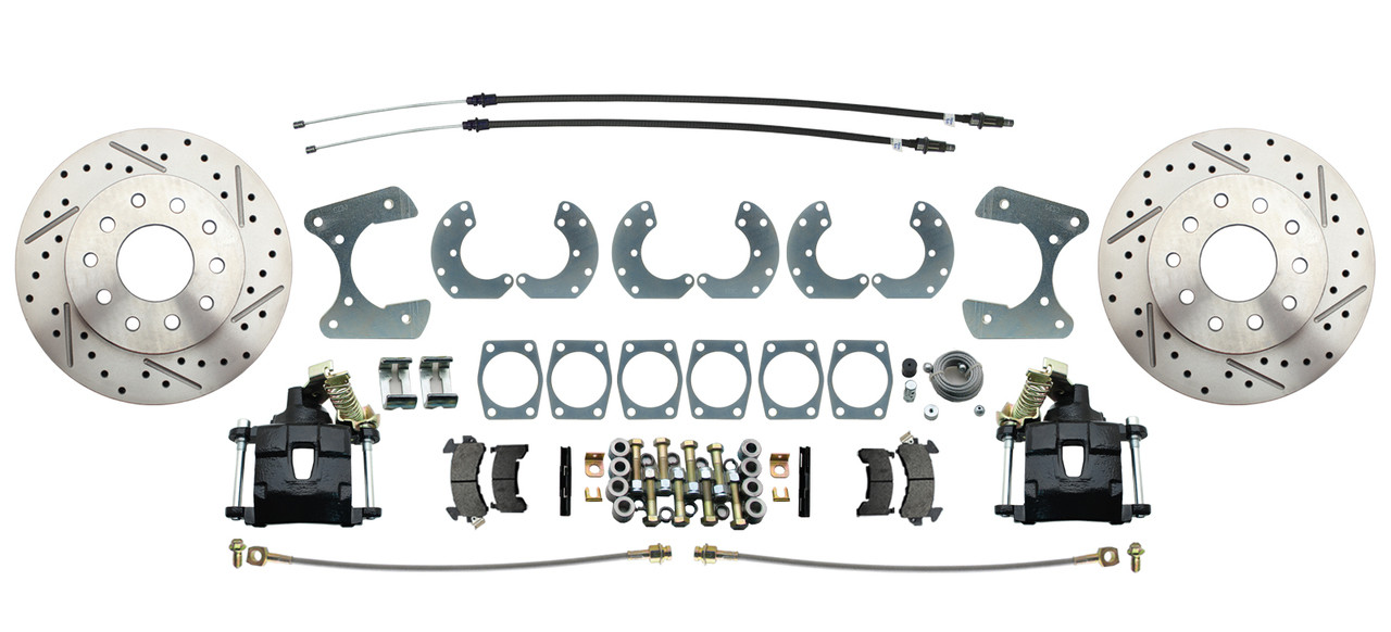 The DBK9 provides an easy to install, bolt on solution for upgrading your pre-1980 Ford passenger car 9” rear-end to disc brake performance. MBM’s kit is unique in that it provides all the brackets and flanges that fit the three most popular sizes of the 9” rear end (3-3/8” x 2”, 3-1/2” x 2-3/8”, 3-9/19” x 2” ). This eliminates all guesswork when purchasing and installing the kit. The DBK9 comes in both standard and high performance models. The high performance LX kits upgrade to cross-drilled and slotted rotors and stainless steel braided brake lines.