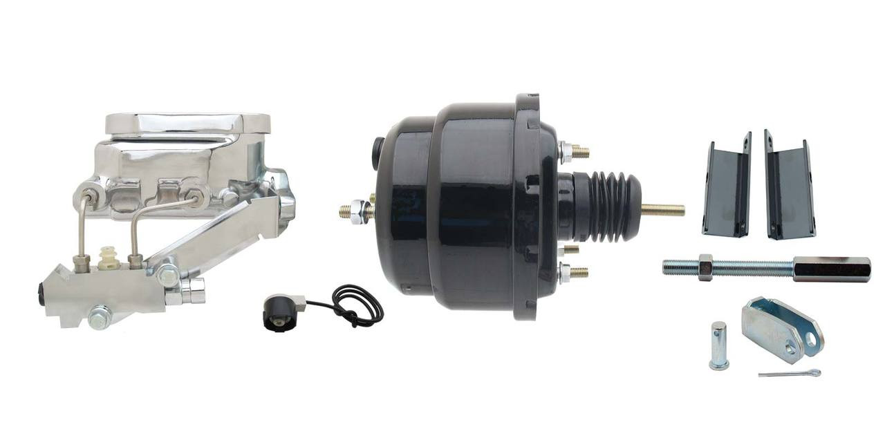 - GMFS1-725- 1955-1958 GM Full Size (Impala, Bel Air) 8" Dual Powder Coated Black Booster Conversion Kit w/ Chrome Flat Top Master Cylinder Left Mount Disc/ Disc Proportioning Valve Kit