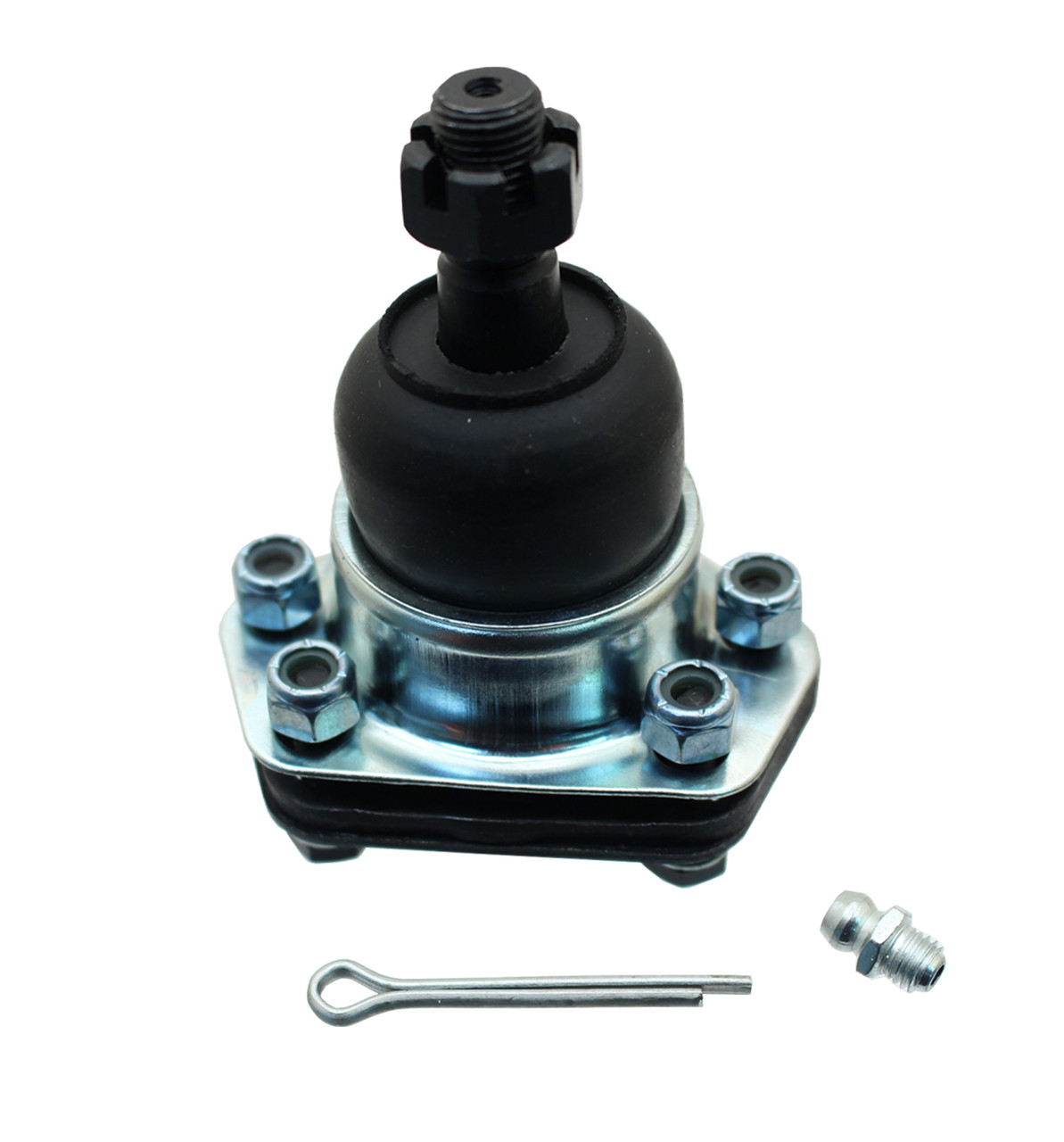 Stock ball joint replacement complete with cotter pin & castle nut. Includes grease fitting & mounting hardware.